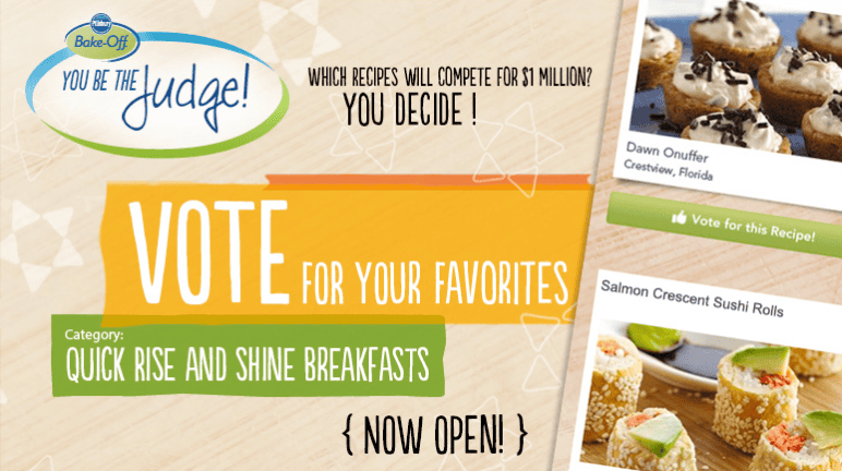 The third and final round of voting for the 2013 Pillsbury Bake-Off. This is our last chance to support one another and get every single CCC member into the finals in Las Vegas! Time to VOTE in the “Quick Rise and Shine Breakfasts” category. *