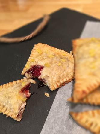 - Spoon 1 tablespoon lemon mixture in center of each wedge on cookie sheets and spread to within 1/2 inch of the edges; top with 1 tablespoon of the blackberry preserves and spread to within 1/2 inch of edges. Top with remaining pie crust wedges. Press edges with fork to seal.
