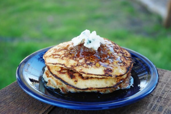 - Working in batches, pour about 1/3 cup batter for each pancake and cook for 2-3 minutes or until the bottom is golden brown. Before flipping the pancake over sprinkle about 1 teaspoon of crumbled blue cheese evenly across the pancake. Flip and continue to cook 2-3 minutes more.