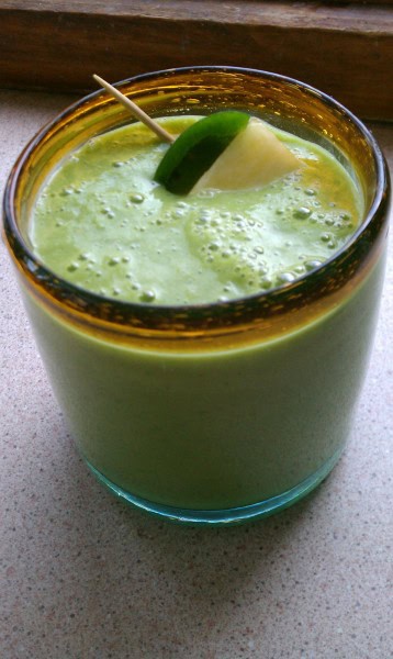- Add all ingredients to blender and process until smooth.Garnish with piece of pineapple and jalapeno,if desired.Serves 3